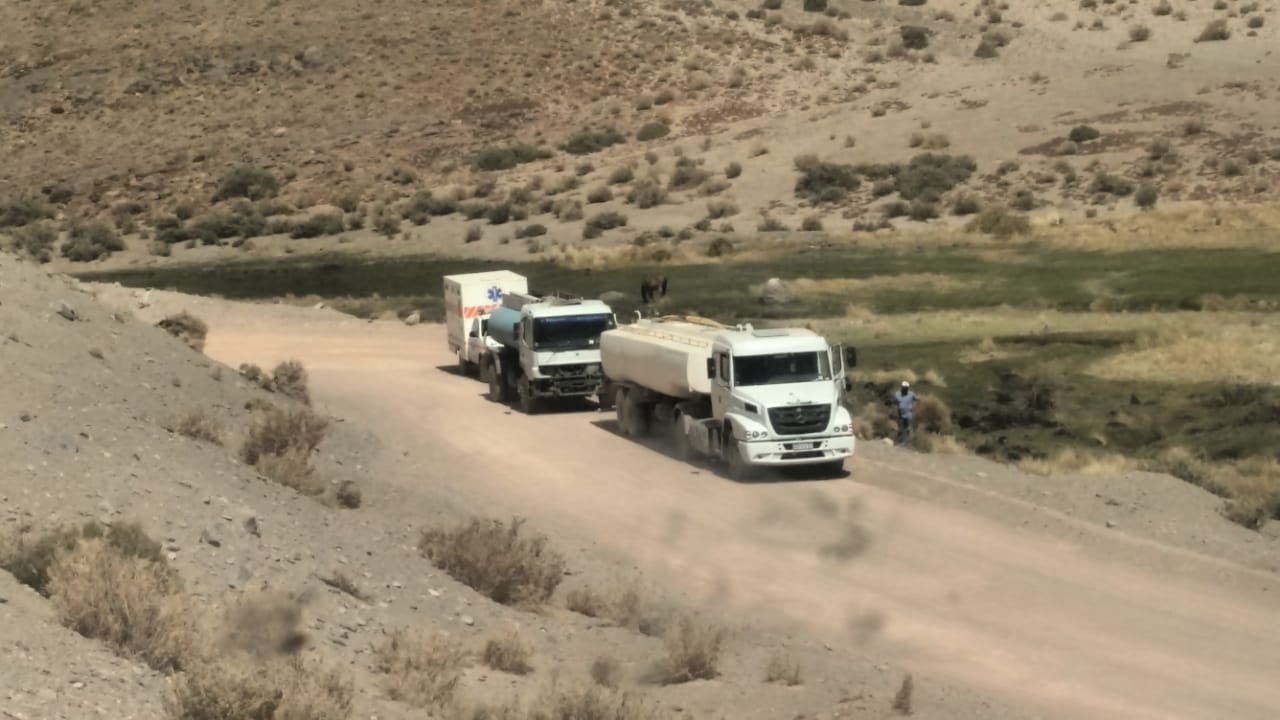 ¿Qué hacen los camiones ahí? Pues bien, acondicionan el camino para que no se levante polvillo. La actividad consiste en regar el camino con el apoyo de la ambulancia para asistir a los choferes de cualquier eventualidad. Vale la pena recordar que el gobierno de Jalil inauguró un reservorio de agua para la población que a posteriori terminó contaminada, debiendo suspender el destino y cambiarlo para riego.