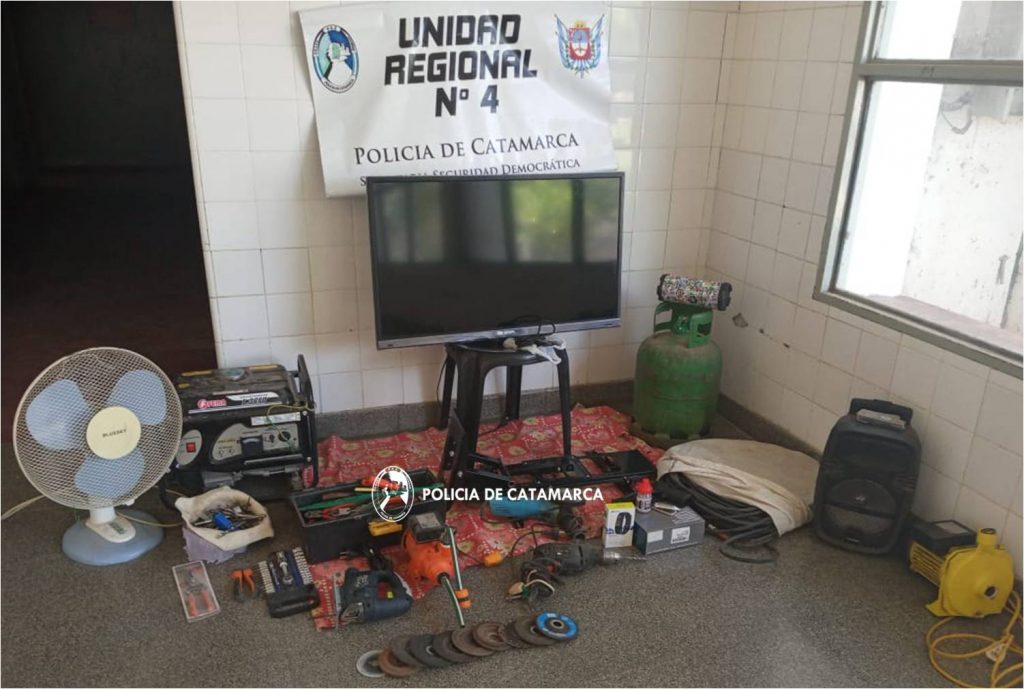 Tras cometer el hecho delictivo, el sujeto se dio a la fuga, tras averiguaciones practicadas, dias pasados, siendo las 11:15 de la mañana de hoy, personal de la Comisaría Departamental Andalgalá logró recuperar un (01) televisor tipo LCD 40 pulgadas, con su respectivo soporte, dos (02) parlantes, un (01) grupo electrógeno, una (01) garrafa de gas de 10 Kg., una (01) sierra caladora, un (01) taladro, una (01) amoladora y discos de corte, una (01) pistola de aire comprimido, dos (02) bombas de agua, un (01) ventilador, un (01) rollo cable y varias herramientas, que quedaron en calidad de secuestro.