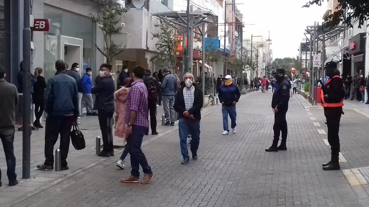 Para este lunes estaba anunciado que los bancos atenderían al público con restricciones y para ello antes se debía obtener un turno por internet. Desde tempranas horas se vieron colas en todos los bancos y un importante aglomeración de gente en la puerta de Banco Nación.