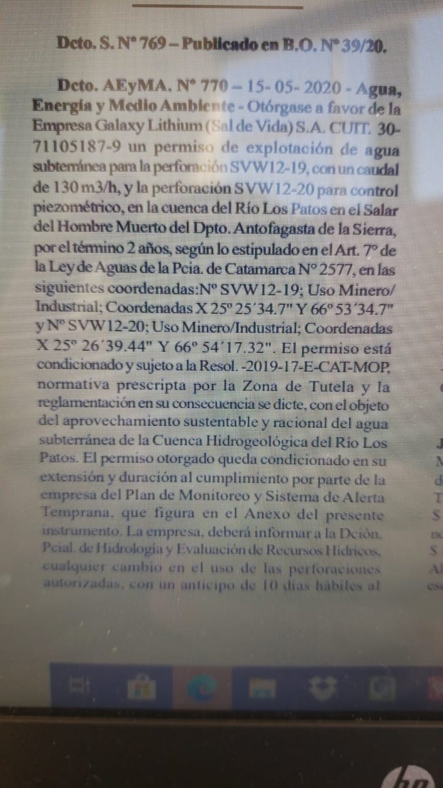No tiene el gobierno de Catamarca licencia Social para explotar el agua del Río Los Patos o su Cuenca Hídrica, de manera que conceder la explotación del agua subterránea por dos años, sin el consentimiento expreso de la Comunidad Atacameña del Altiplano, constituye una clara violación de derechos adquiridos y el acto administrativo está viciado de nulidad desde el inicio "ab-initio", pues carece de los requisitos esenciales para que surta efectos jurídicos. Seria delito que la cuestion tuviera ejecución material. Es bueno recordar a la población lo siguiente: A partir de aquel día, por la reforma del Constitución Nacional del año 1994, los derechos indígenas, preexistentes al derecho positivo argentino, tomaron estado y rango constitucional, mal que le pese a muchos, y la Asamblea constituyente redactó, aprobó y sancionó, en tanto que el Poder Ejecutivo Nacional promulgó, la reforma constitucional con carácter de ley de leyes, también llamada "Carta Magna" , el artículo 75 inciso 17 de la Constitución Nacional establece que corresponde al Congreso: