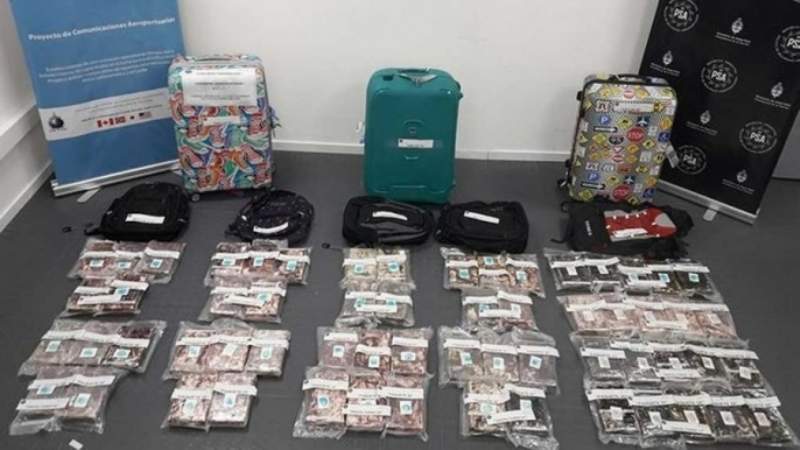 Una vez en el patio de valijas, cada equipaje comenzó a ser escaneado, se confirmó que en su interior había droga y todos fueron detenidos.