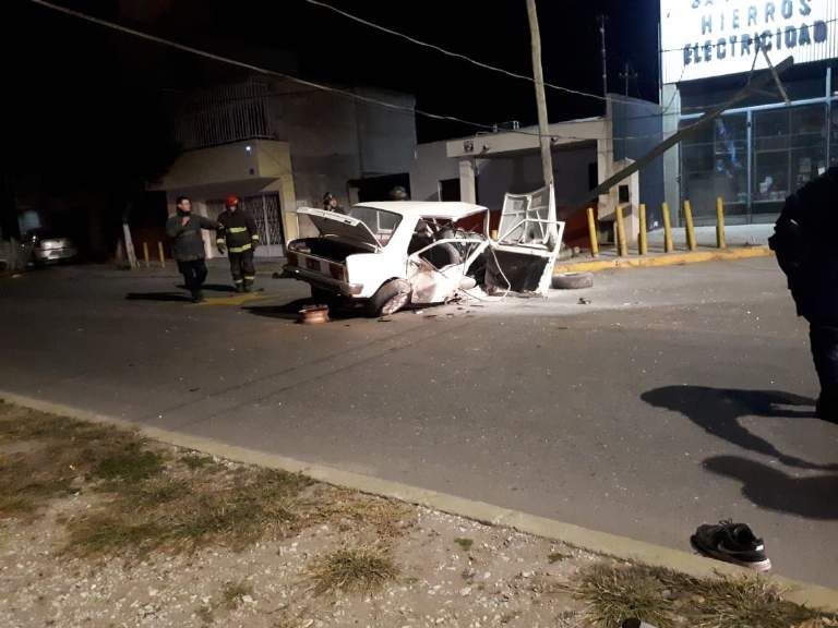 A las 03.05 se registró un siniestro vial en avenida Presidente Castillo frente al corralón la curva. En el lugar un automóvil marca Fiat modelo 128 color blanco, dominio XDM-320, derrapó en la curva y terminó impactando un poste de luz de madera, los ocupantes quedaron en el interior, el motor comenzó a prenderse fuego.