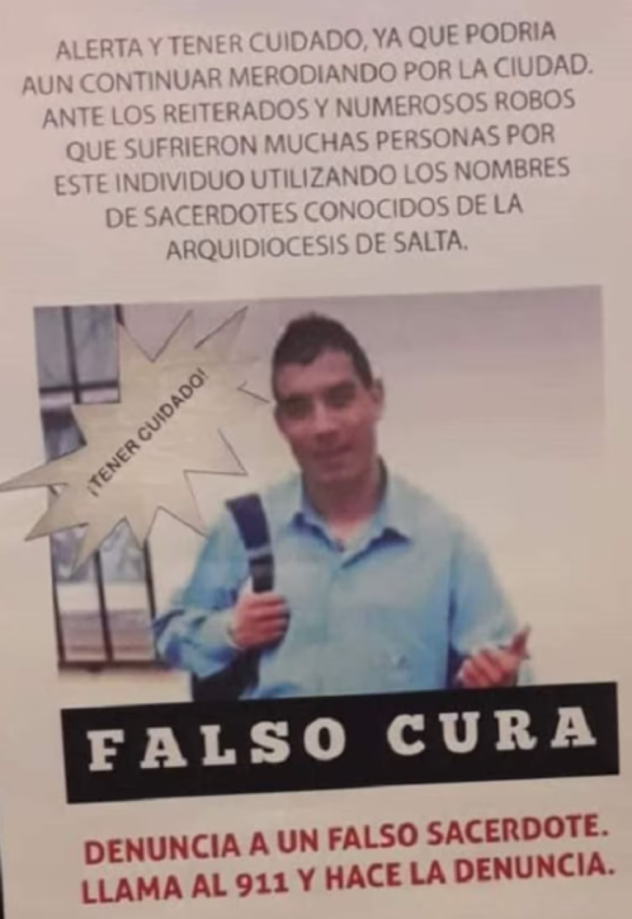 En los últimos tiempos, el Arzobispado de Salta había advertido sobre un hombre que se hacía pasar por cura para aprovecharse de la confianza de los fieles y robarles. Después de varios meses de investigación, durante los cuales se confirmó que había cometido varios delitos bajo esta modalidad, finalmente se detuvo al sospechoso, quien ahora está a disposición de la justicia.