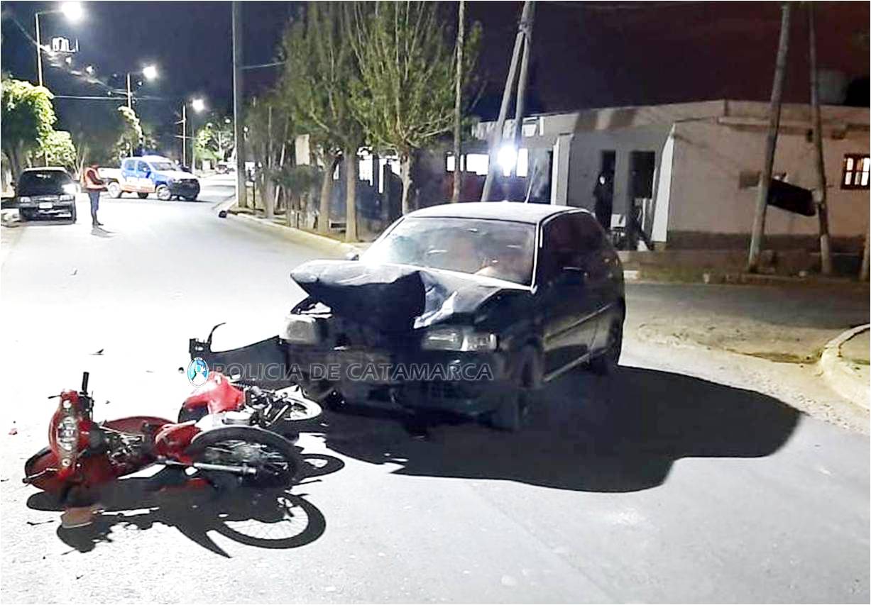 Ayer, en la intersecciòn de  Avenida Girardi y calle Bolívar, de la localidad de San José de Piedra Blanca, Departamento Fray Mamerto Esquiú, se produjo un siniestro vial protagonizado por un automóvil Volkswagen Gol gris, dominio GRI-134, al mando de Raúl Ricardo Rodríguez (27), que por causas que se tratan de establecer colisionó con una motocicleta Motomel Blitz 110 cc., de color rojo, en la que circulaba Leandro Adrián Reinoso (22).