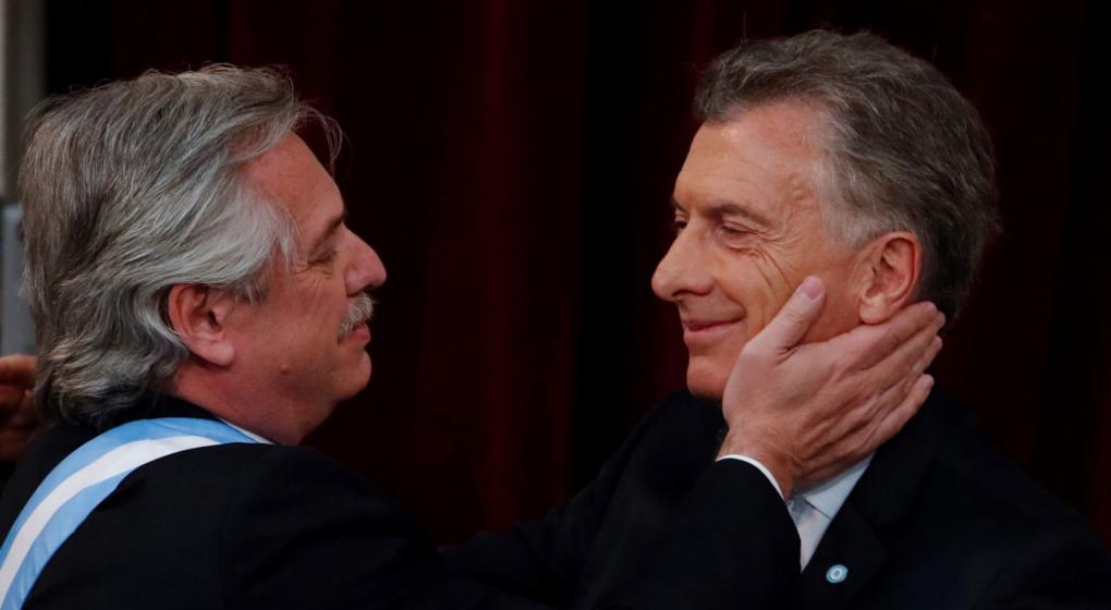 En consecuencia y tal como lo indica el protocolo, Mauricio Macri entregó la banda y el bastón presidencial a Alberto Fernández, el nuevo Presidente de la Argentina. Fue entonces, que ambos se fundieron en un respetuoso abrazo.