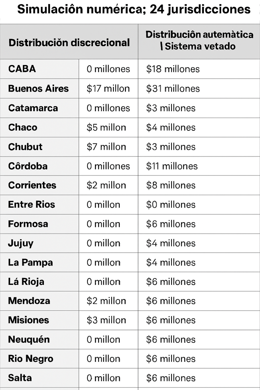 En este ejemplo, se ve claramente cómo en el esquema discrecional algunas provincias pueden recibir mucho más o incluso nada, mientras que en el automático todas obtienen una porción proporcional según el coeficiente de coparticipación.
