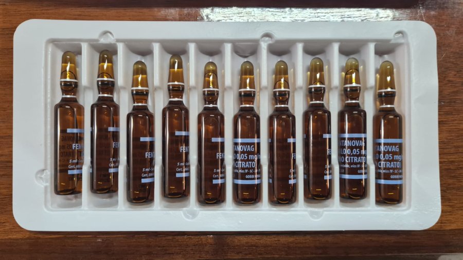 En el paquete se hallaron 500 ampollas de vidrio rotuladas con la leyenda “Quimea prinosil, fentanilo de 0.05mg, solucition inyectable, con vencimiento 09/2027 elaborado por quimfa S.A.”, de industria paraguaya.