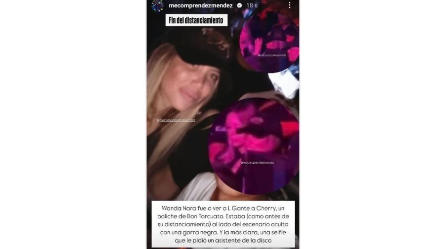 Más tarde, el periodista Gustavo Mendez agregó que "Wanda fue a ver a L-Gante a Cherry, un boliche de Don Torcuato. Estaba al lado del escenario", relató según le informaron. Para evitar el foco sobre ella, la conductora de Telefe tenía puesta una gorra negra.